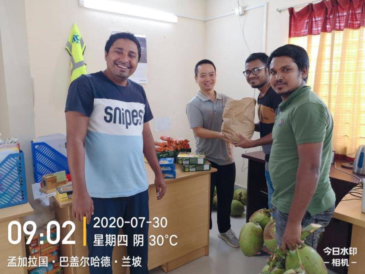 位于南亚的孟加拉国新冠肺炎疫情发展形势较为严峻,高温持续袭来,为中国一冶在孟工程建设带来双重挑战。孟加拉分公司达卡供水工程项目部的124名中外劳工顶着高温酷暑天气,坚决完成每天管网开挖以及铺设任务,为工程如期交付而不懈奋斗,为周边居民早日带来“甘泉”。孟加拉分公司电力小镇项目部为坚守在项目现场的50余名当地聘用工人和管理人员送去当地特产椰子、清凉饮料、防暑药品以及防疫物资,员工们脸上都洋溢着灿烂的笑容,用点滴行动搭建爱的“桥梁”,让“关怀”不分国界。该项目部还积极开展防暑安全演练和防暑安全教育活动,叮嘱大家在作业的同时注意做好防暑降温,合理安排工作,确保身体健康。
