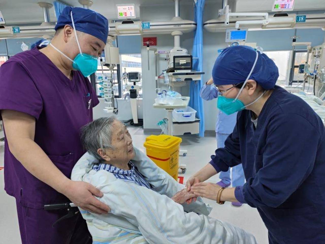 ICU护士长孙亮介绍,翁奶奶住院期间患上了日落综合征,白天嗜睡,夜间少眠多动。医护人员白天有规律性的搀扶翁奶奶下床活动,晚间嘱其护工睡前为翁奶奶增加一杯热牛奶,播放轻音乐助眠。几次深夜,当班护士听见翁奶奶有喊老伴的声音,她们主动走上前去,抚慰翁奶奶,并次日视频连线其老伴,一解其相思之苦。经多方努力,翁奶奶情绪稳定下来,生活作息也规律不少,精神头也有了很大改观。