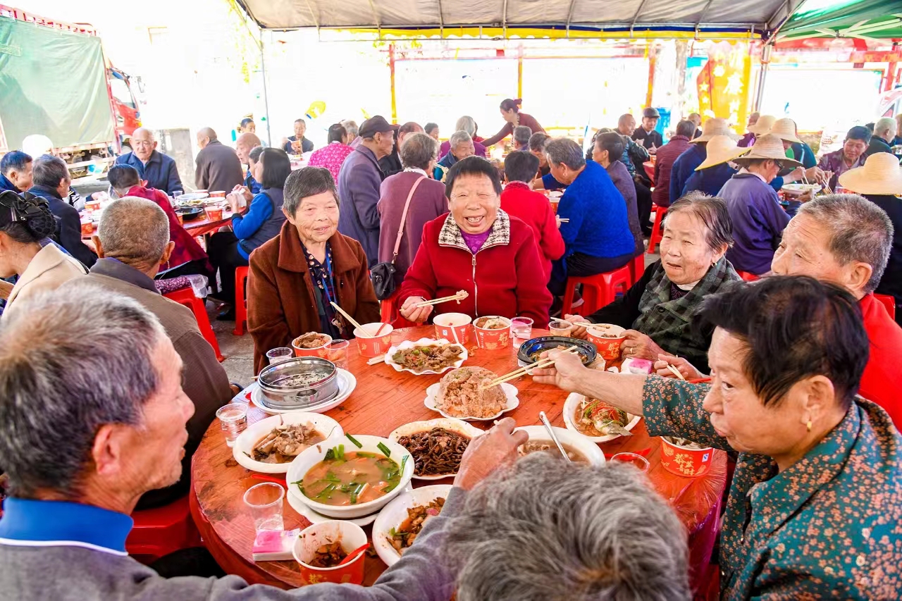 “饭菜蛮好吃的,戏也挺好看,大家坐在一起好热闹。”正在看戏的老人汪松寿高兴得说道。