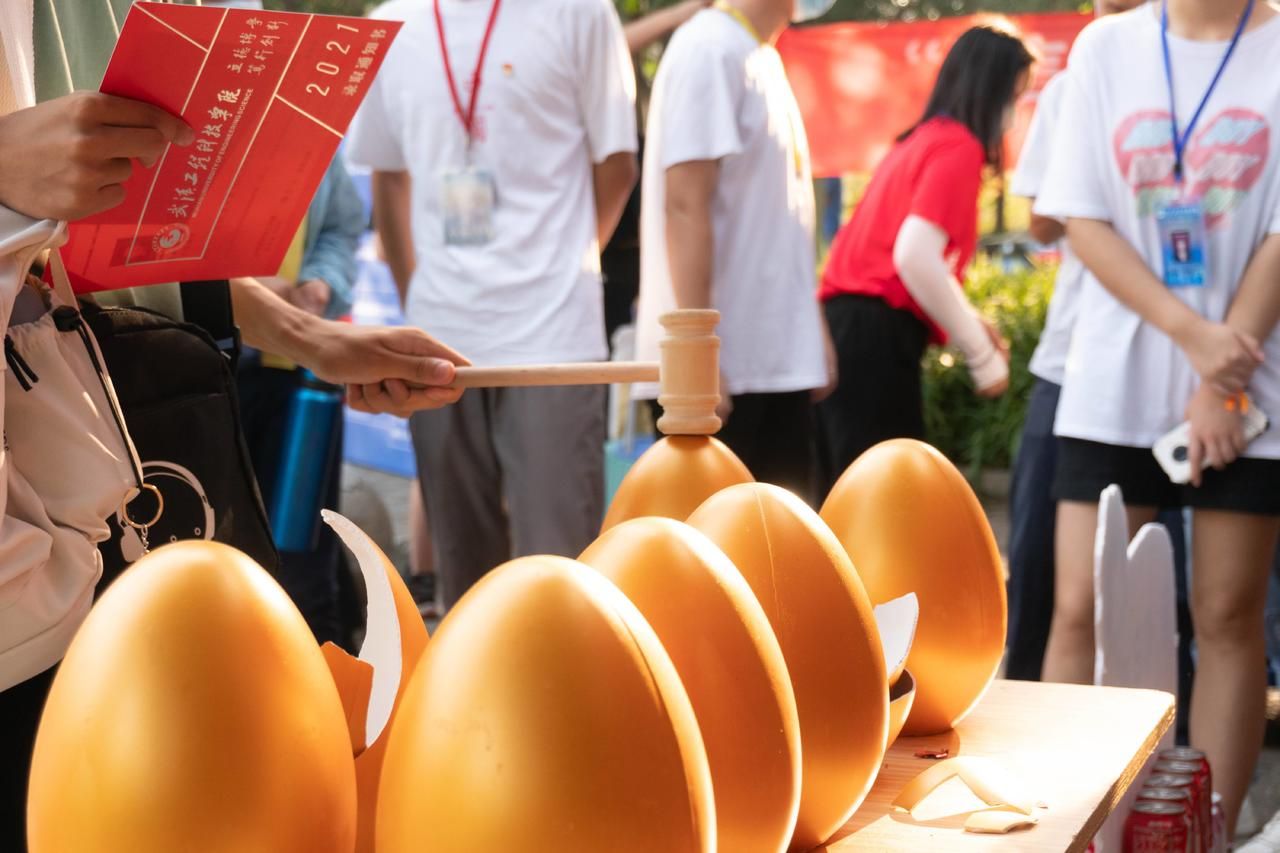 在信息工程学院的迎新点处,放置在桌上的一枚枚金蛋在阳光下显得格外耀眼。刚砸开金蛋的男生是21级电子信息工程专业的学生盛奕杰,他在破碎的蛋壳中抽出纸条,上面赫然写着“一次和辅导员一起查寝的机会”,一旁围观的同学们哄然大笑:“可以去查女寝了!”“没想到我是今天第一个来学院报到的新生,而且砸开了人生中第一个金蛋,这个报到太惊喜了。”盛奕杰激动地说。