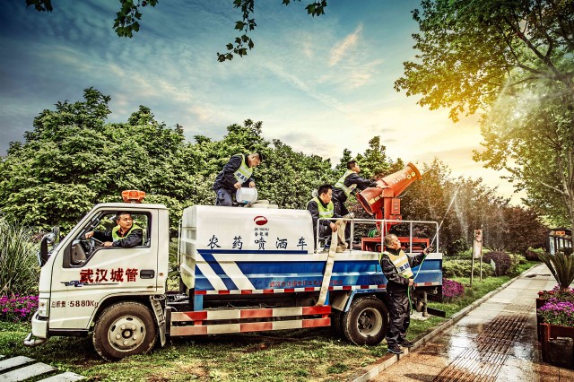 “园丁城管”与绿化作业车辆街拍,武昌城管绿化队有各种作业车辆15台,包括洒水浇灌车、农药喷洒车、高空作业车等。