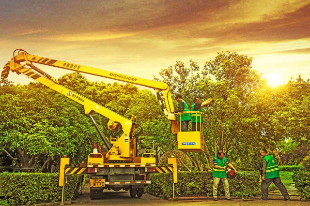 高空作业车是由液压或电动系统支配多支液压油缸,能够上下举升进行作业的一种车辆。采用液压传动的载人高空车,是当代先进的特种机械设备,在作业斗内和回转座上均设有操纵装置, 远距离控制发动机的启动/停止、高速/低速,采用电液比例阀控制臂的动作,工作臂可左、右360°连续旋转。在绿化队主要用于行道树高空修剪、树障排查处理以及各种“110”处警和突击任务。